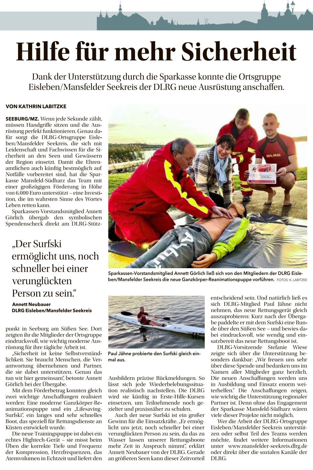 Seeburg/MZ. Wenn jede Sekunde zählt, müssen Handgriffe sitzen und die Ausrüstung perfekt funktionieren. Genau dafür sorgt die DLRG-Ortsgruppe Eisleben/Mansfelder Seekreis, die sich mit Leidenschaft und Fachwissen für die Sicherheit an den Seen und Gewässern der Region einsetzt. Damit die Ehrenamtlichen auch künftig bestmölich auf Notfälle vorbereitet sind, hat die Sparkasse Mansfeld-Südharz das Team mit einer großzügigen Förderung in Höhe von 6.000 Euro unterstützt - eine Investition, die im wahrsten Sinne des Wortes Leben retten kann. weiterlesen ...